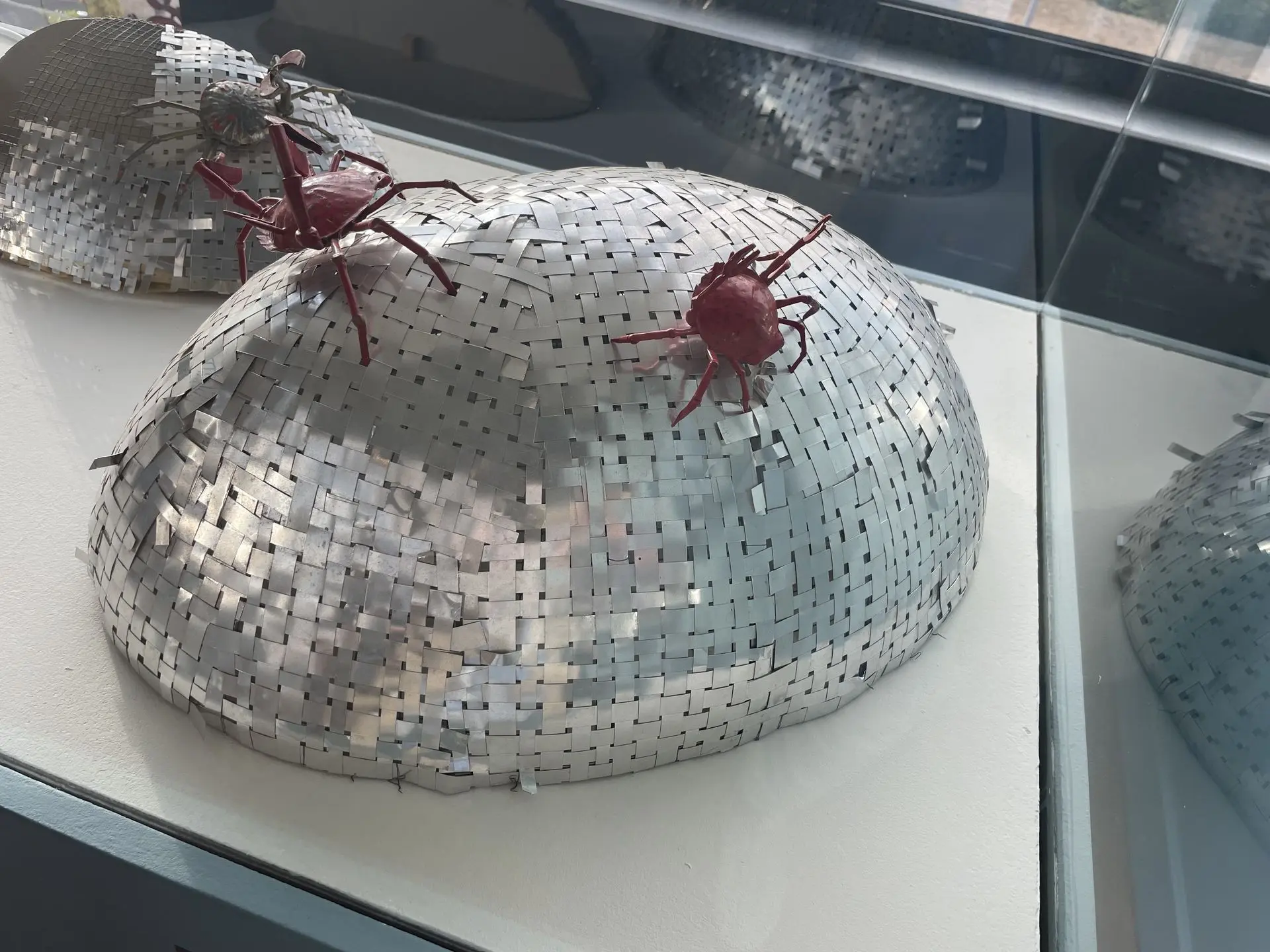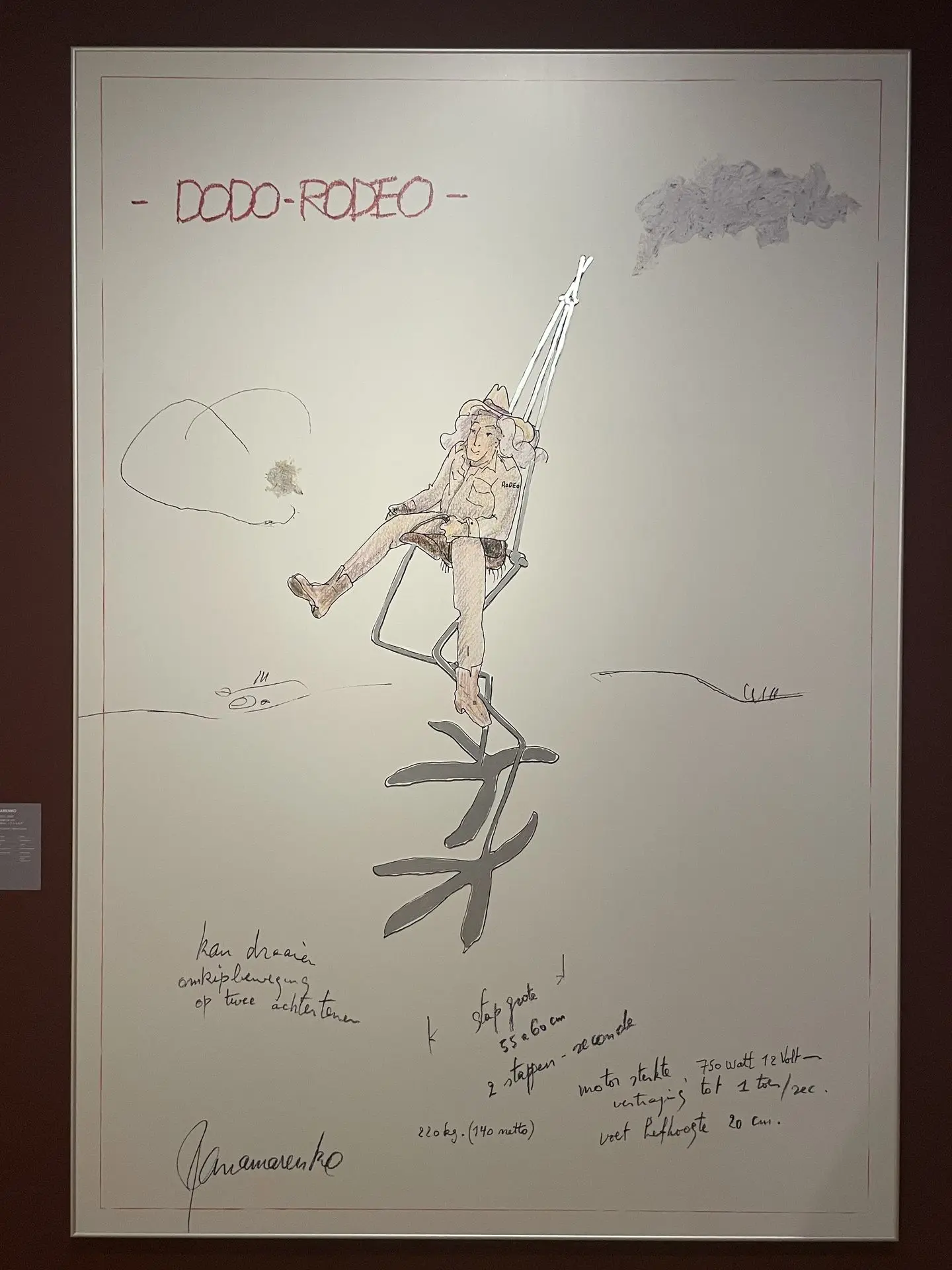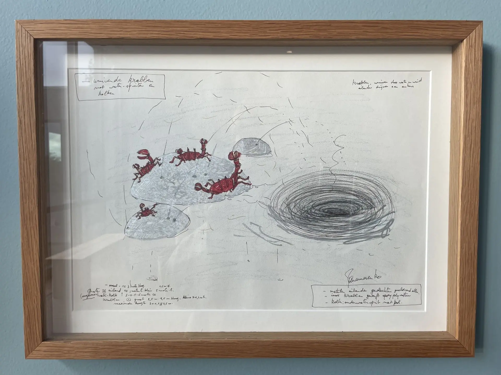 Sein größtes Werk „Wuivende Krabben“ (2011) ist eines der Wahrzeichen von Knokke: Eine Insallation aus drei schwimmenden Edelstahl-Inseln, auf denen sich sechs rote Krebse mit geöffneten Scheren im Zegemeer im Wind wiegen. Sozusagen ein technisches Wasserballett, besonders gut zu bewundern von der Terrasse des La Reserve. Die Pläne dazu sind in der Ausstellung zu sehen.